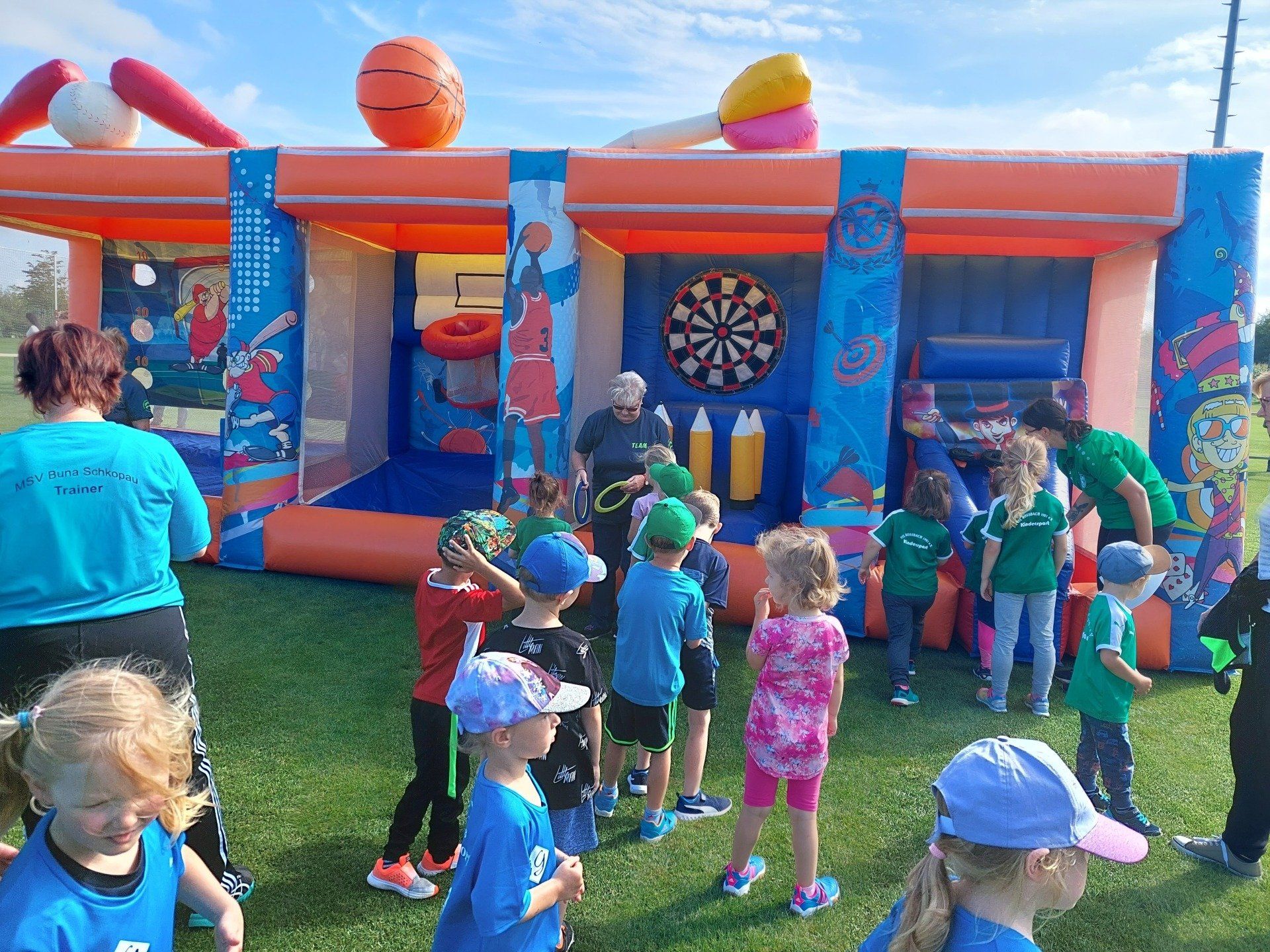 An 8 Stationen, wie z. B. Weitwurf, Standweitsprung oder Sprint, konnten sie ihr Können unter Beweis stellen. Auch Riesenpuzzle für den Denksport waren dabei. Am meisten begeisterte unsere Sportkinder aber die riesige aufblasbare Hindernisbahn.